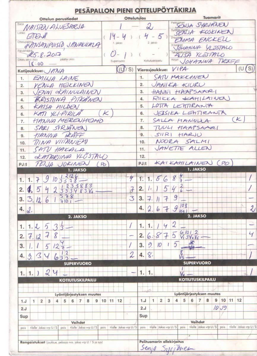 | 16.8.2017 18:00 | ViPa N | Päiväkummun pedot | 0-1 (12-12, 7-10) | ||