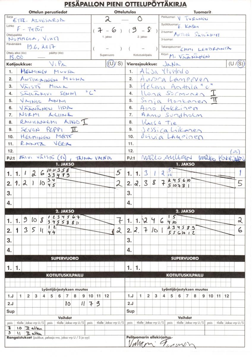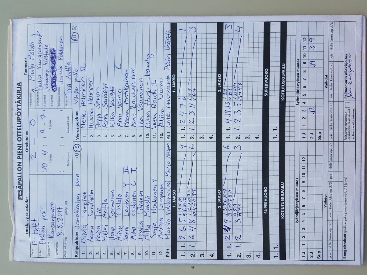 | 8.8.2017 18:00 | Jana FT | Vipa F-tytöt | 2-0 (10-4, 9-7) | näytä | |