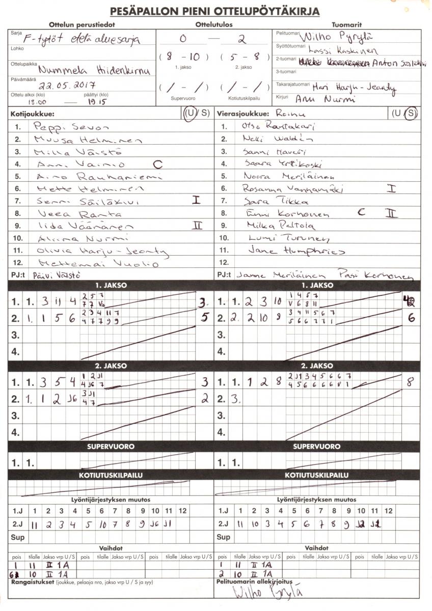 | 14.8.2017 18:00 | Vipa F-tytöt | Espoon pesis | 2-0 (1-0, 1-0) | ||