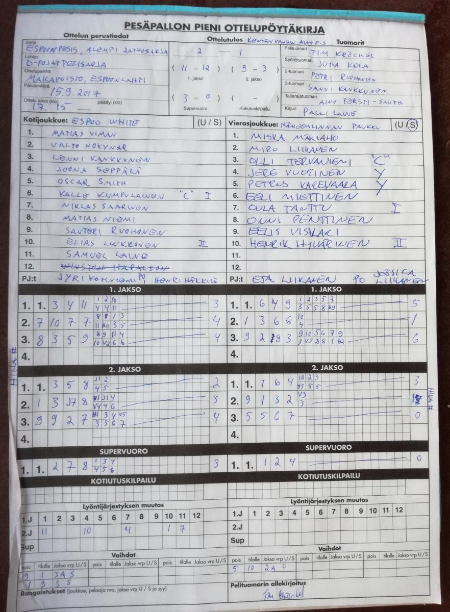| 27.6.2017 18:00 | Paukku | Espoo Yellow | 0-2 (0-12, 2-8) | näytä | |