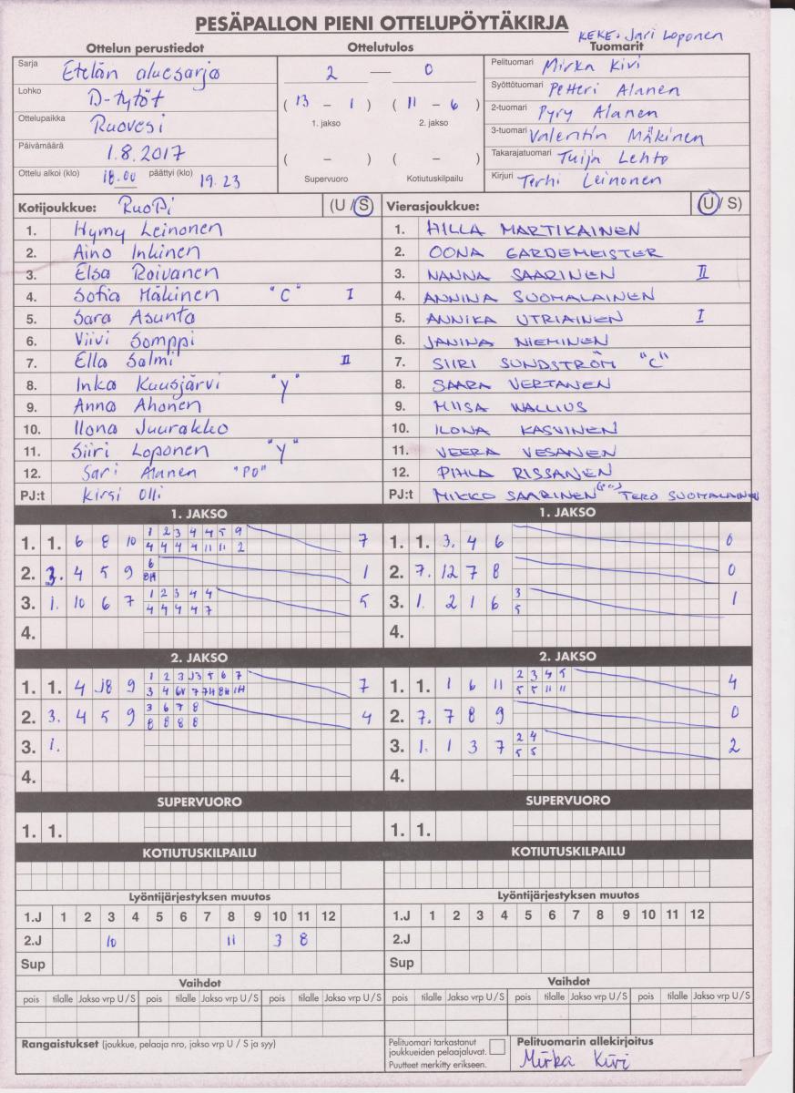 | 1.8.2017 18:00 | RuoPi Dt | Puhti ET | 2-0 (13-1, 11-6) | näytä | |