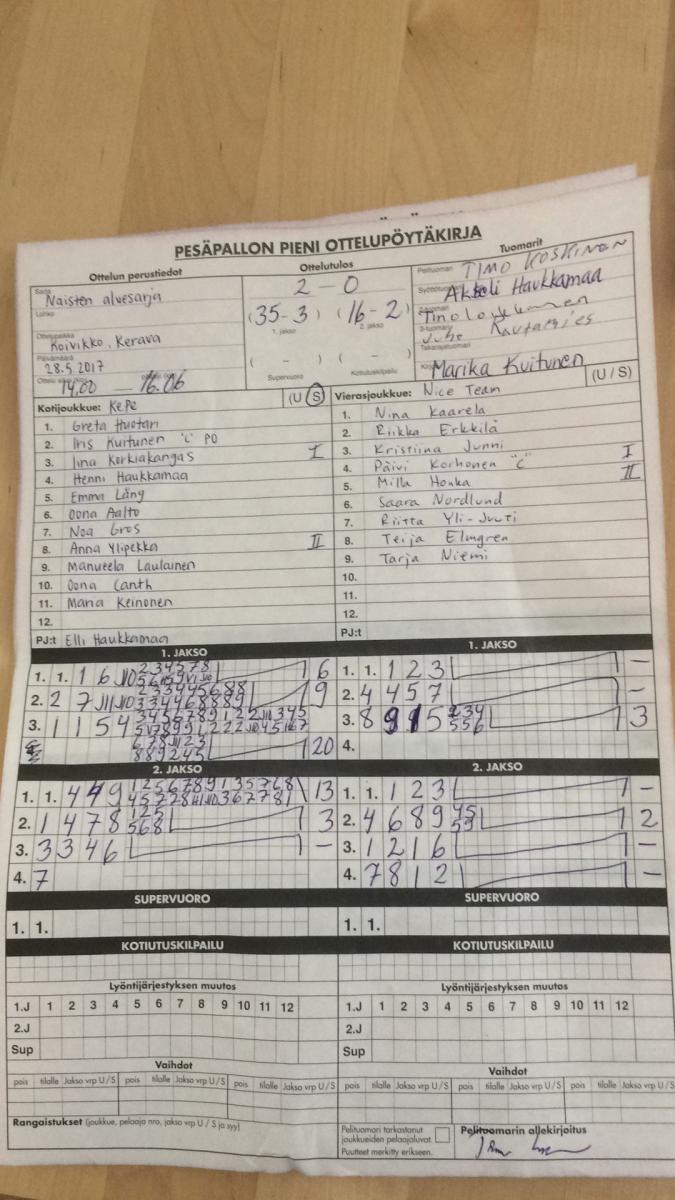 | 28.5.2017 14:00 | KePe | Nice-Team | 2-0 (35-3, 16-2) | näytä | |