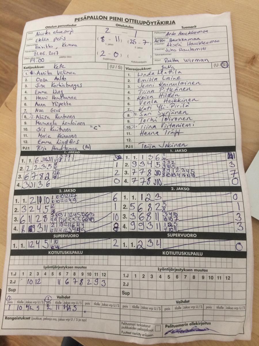 | 21.5.2017 14:00 | KePe | NAS Jana | 2-1 (8-11, 25-7, 2-0) | näytä | |