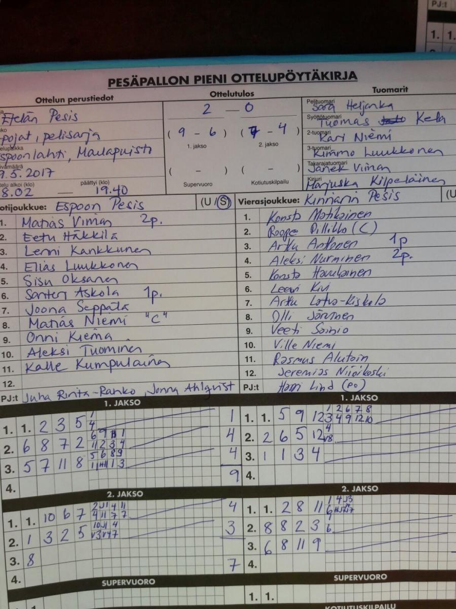 | 19.5.2017 18:00 | Espoo Yellow | Kipe06 White | 2-0 (9-6, 7-4) | näytä | |
