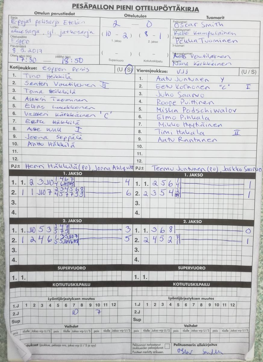 | 29.8.2017 18:00 | Kepe E-pojat | VJJ-05 | 2-0 (9-6, 11-6) | näytä | |
