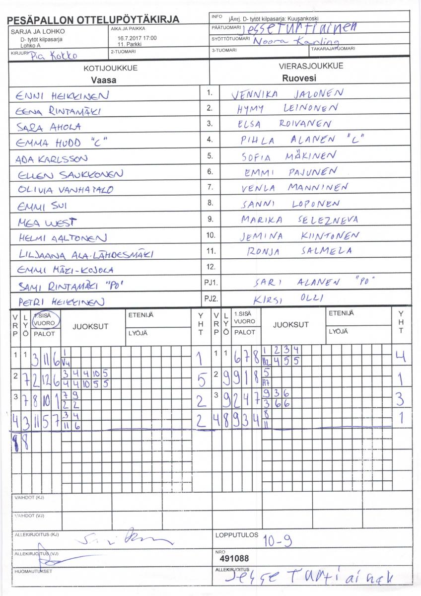 | 18.7.2017 11:00 | 15. Turjanpuisto | Joensuu | Vaasa | 9-15 | näytä |