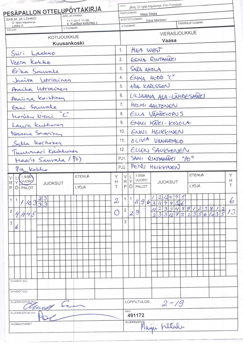 | D- tytöt kilpasarja - Lohko A | 17.7.2017 15:00 | 4. Kupittaa kivituhka 2 | Joensuu | Kuusankoski | Vaasa |
