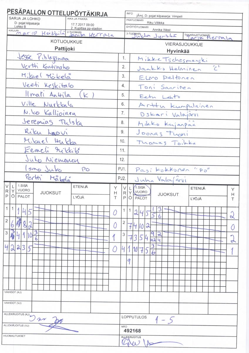 | D- pojat kilpasarja - Lohko B | 19.7.2017 16:00 | 2. Kupittaa pp-stadion | Pöytyä | Hyvinkää | Pattijoki |