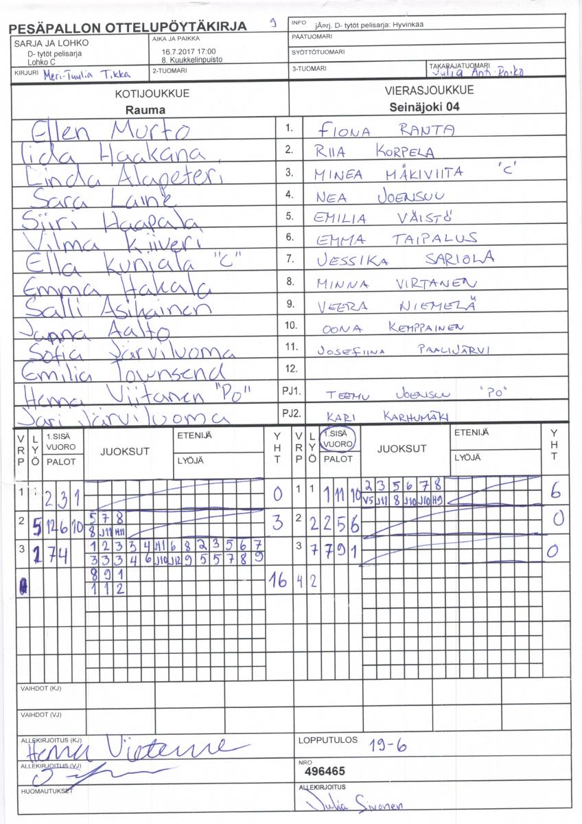 | D- tytöt pelisarja - Lohko C | 18.7.2017 11:00 | 8. Kuukkelinpuisto | Vimpeli | Seinäjoki 04 | Rauma |
