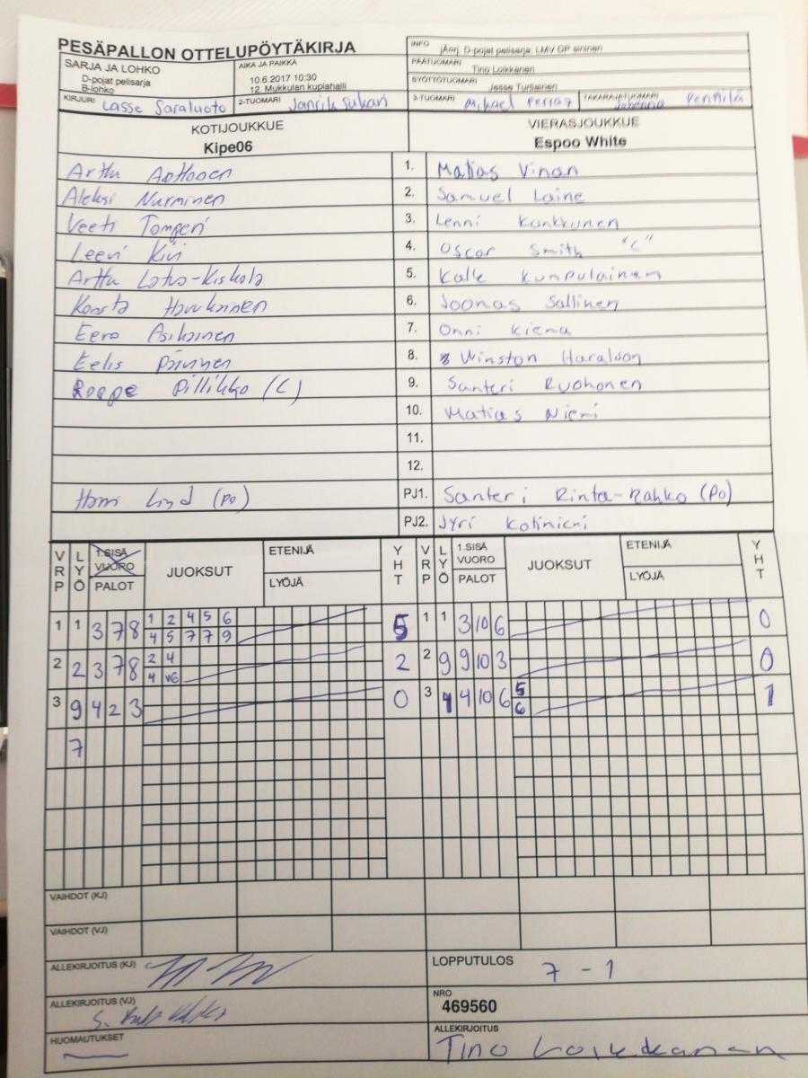 | D-pojat pelisarja - B-lohko | 9.6.2017 14:00 | 12. Mukkulan kuplahalli | Espoo White | LP Loimaa | Kipe06 |