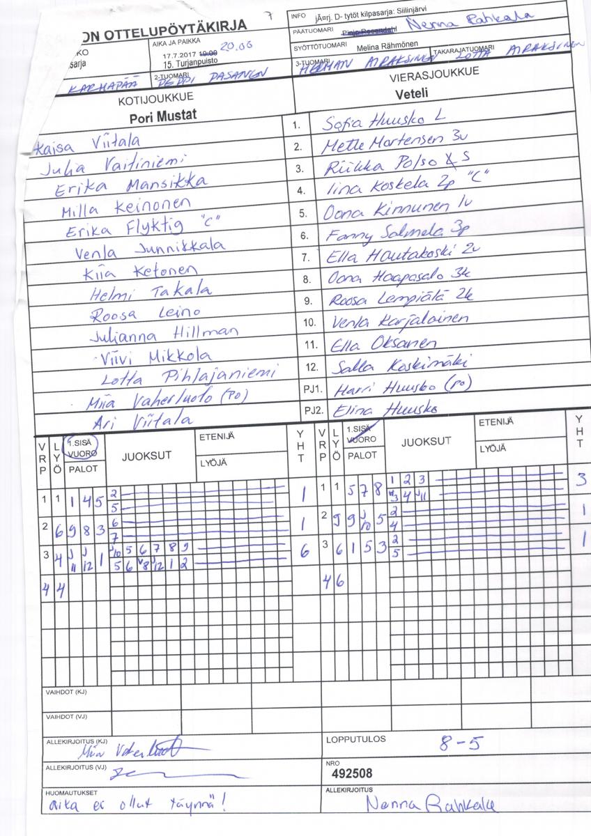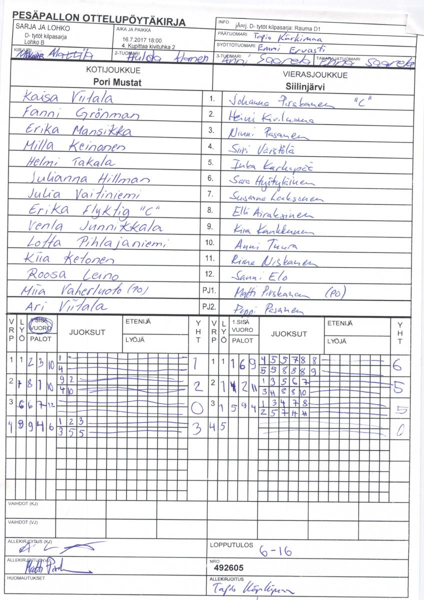 | D- tytöt kilpasarja - Lohko B | 16.7.2017 19:00 | 4. Kupittaa kivituhka 2 | Oulu | Veteli | Pori Mustat |