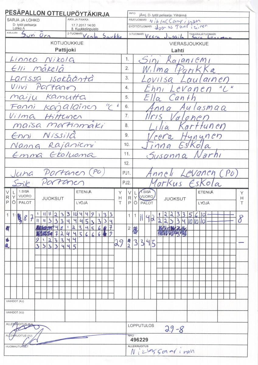 | 17.7.2017 14:00 | 8. Kuukkelinpuisto | Pattijoki | Lahti | 29-8 | näytä |