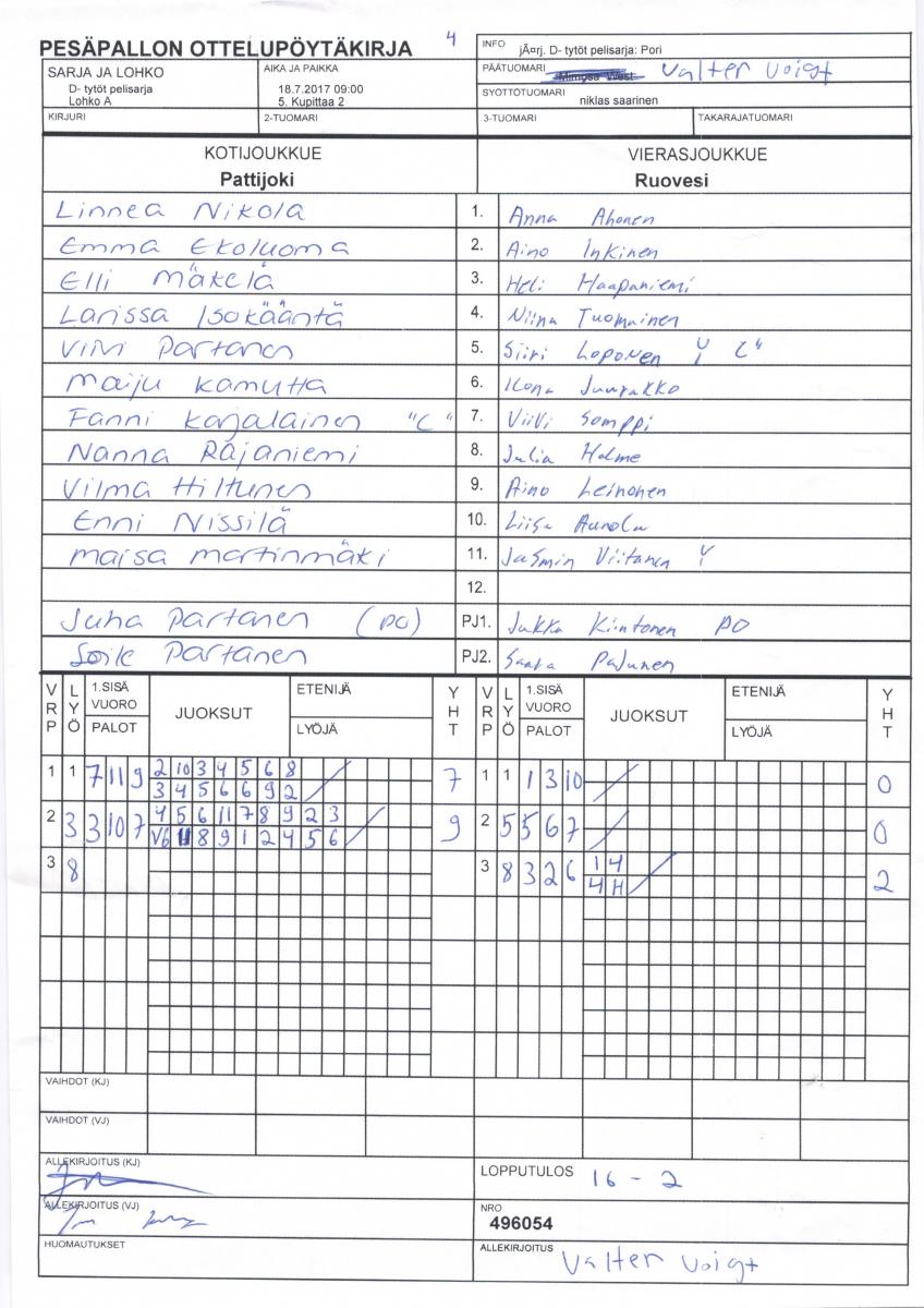 | D- tytöt pelisarja - Lohko A | 16.7.2017 19:00 | 5. Kupittaa 2 | Pattijoki | Joensuu | Ruovesi |
