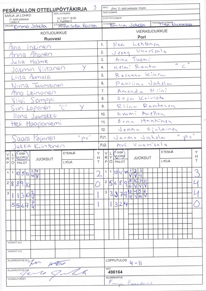 | D- tytöt pelisarja - Lohko A | 17.7.2017 18:00 | 26. Kirkonkylä, Rusko | Pori | Joensuu | Ruovesi |