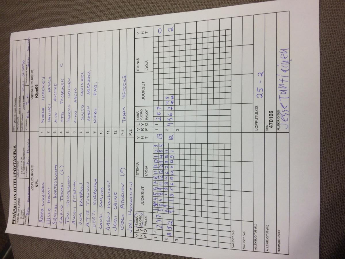 | 9.6.2017 14:00 | 6. Paavolan rouhenurmi | KPL | Kipe06 | 25-2 | näytä |