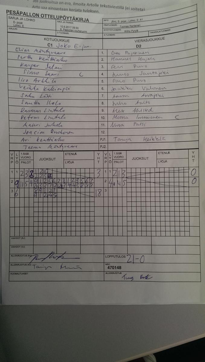 | Lohko. E | 10.6.2017 13:00 | 3. Kisapuisto hiekkatekonurmi (juniorikenttä) | LMV EP | Joko E | Kipe06 |