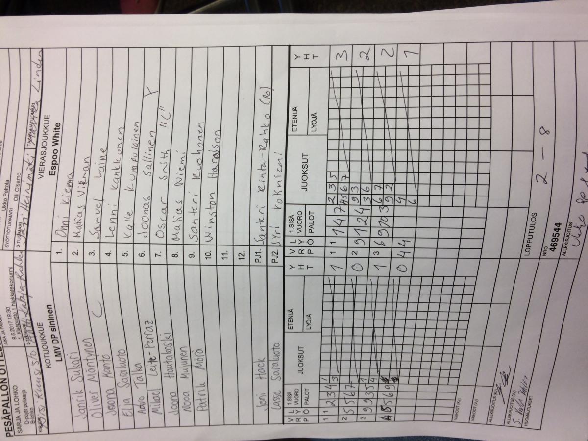 | 9.6.2017 19:30 | 1. Kisapuisto 1 hiekkatekonurmi | LMV DP sininen | Espoo White | 2-8 | näytä |