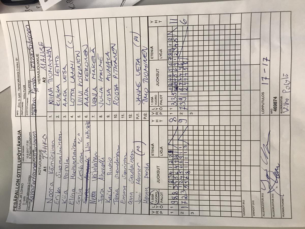 | Ylempi jatkosarja C-lohko | 10.6.2017 18:30 | 6. Paavolan rouhenurmi | Roihu | LMV Dt | Tahko |