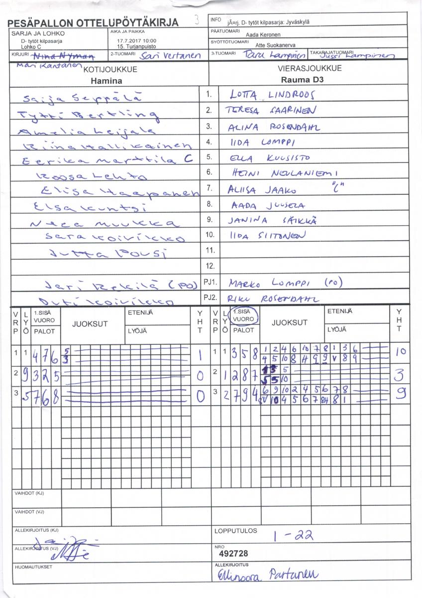 | D- tytöt kilpasarja - Lohko C | 16.7.2017 19:00 | 14. Teräsrautela | Jyväskylä | Ylivieska | Rauma D3 |
