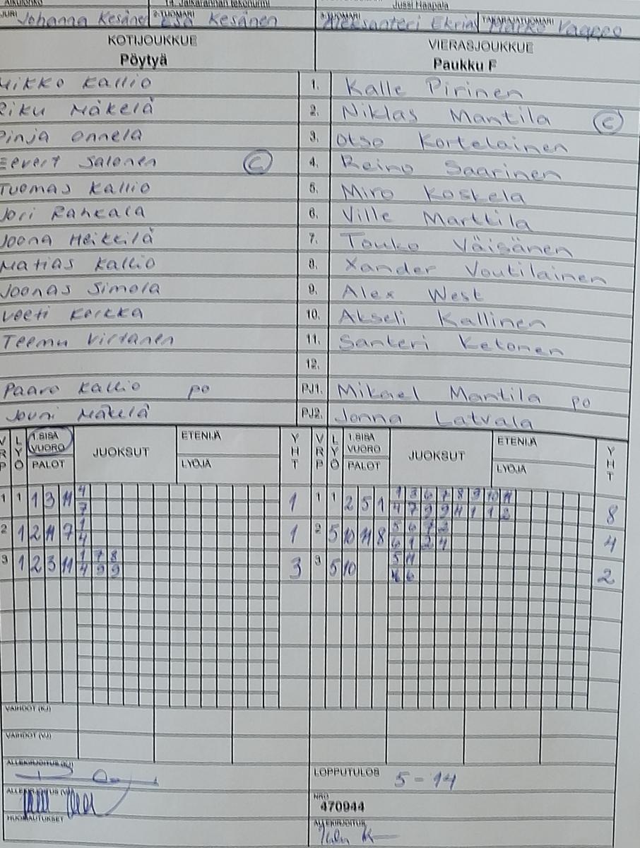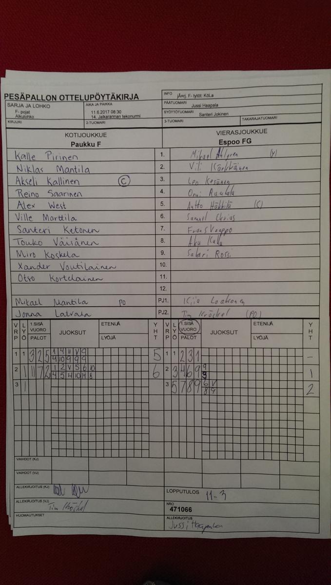 | F- pojat - Alkulohko | 10.6.2017 16:00 | 9. Liipolan rouhenurmi | Espoo FG | LMV | Paukku F |