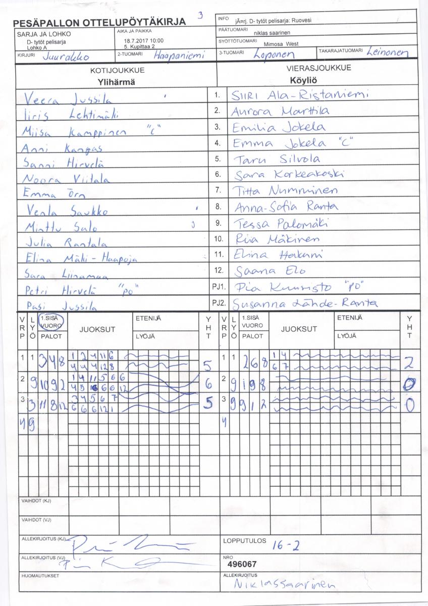 | D- tytöt pelisarja - Lohko A | 16.7.2017 18:00 | 5. Kupittaa 2 | Ruovesi | Pori | Köyliö |