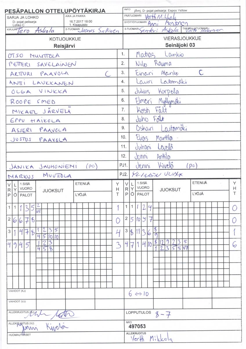 | 16.7.2017 18:00 | 1. Kisapuisto | Reisjärvi | Seinäjoki 03 | 8-7 | näytä |