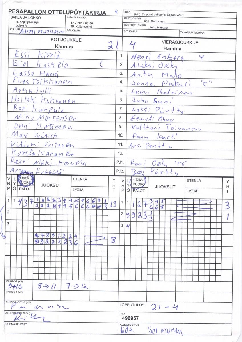| D- pojat pelisarja - Lohko A | 16.7.2017 18:00 | 20. Piispanlähde | Koskenkorva | Espoo White | Hamina |