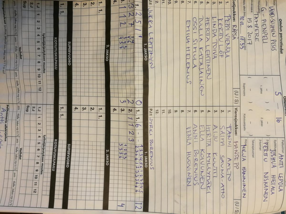 | 19.8.2017 10:00 | Räpsä G-Junnut | Manse PP | 5-16 | näytä | |