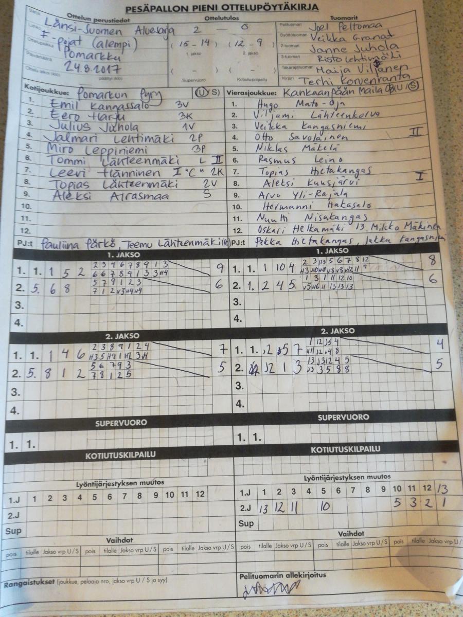 | 27.7.2017 18:00 | PomPy F-pojat | Kama F08 | 2-0 (10-7, 20-9) | näytä |