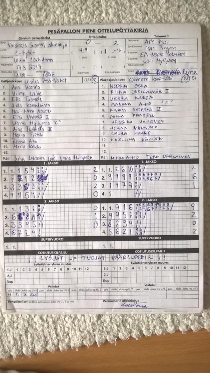 | 17.8.2017 | Ulvila | Kokemäki | 0-2 (4-9, 1-13) | näytä | |