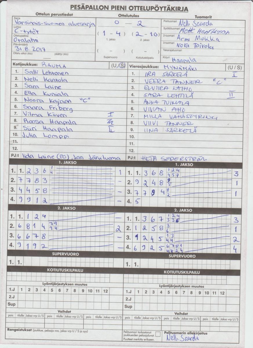 | 31.8.2017 | Rauma | Mynämäki | 0-2 (1-4, 2-10) | näytä | |
