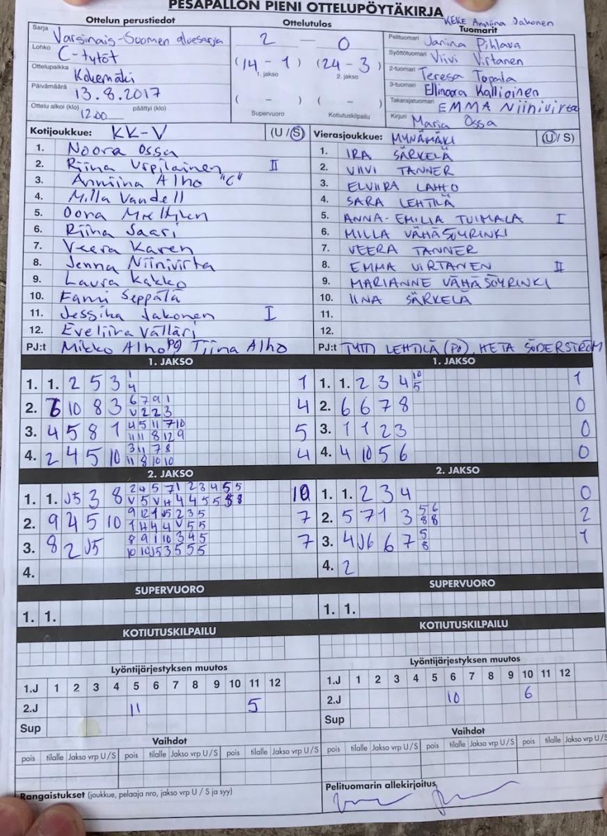 | 17.5.2017 | Mynämäki | Kokemäki | 0-2 (1-16, 1-7) | ||