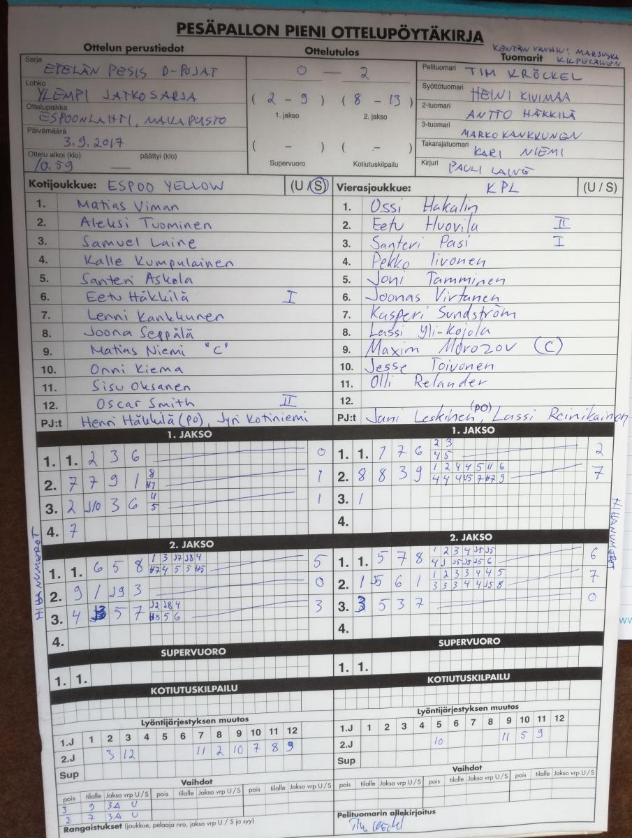 | 2.9.2017 00:00 | KPL | Tahko Yellow | 2-0 (25-3, 13-6) | ||