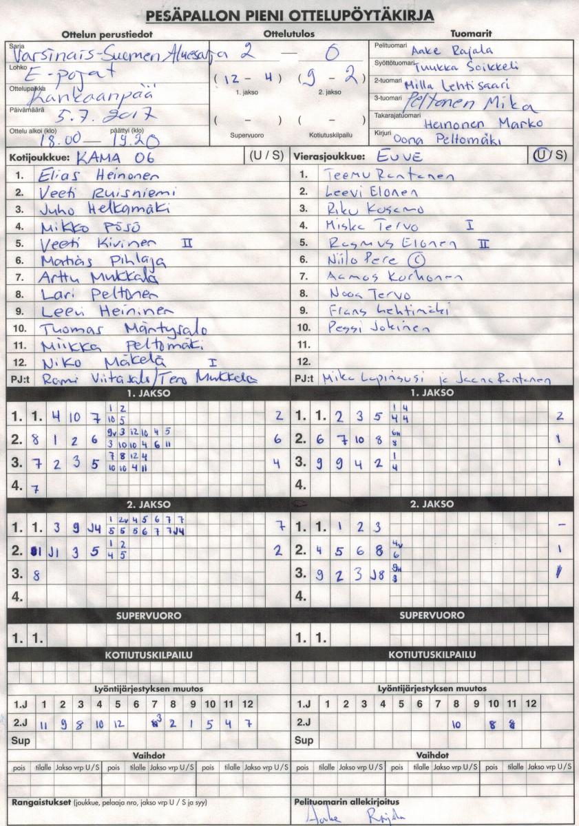 | 3.7.2017 | Kankaanpää 06 | Eurajoki | 2-0 (12-4, 9-2) | näytä |