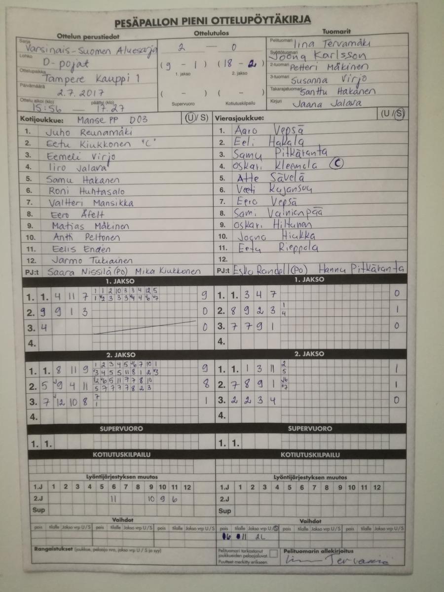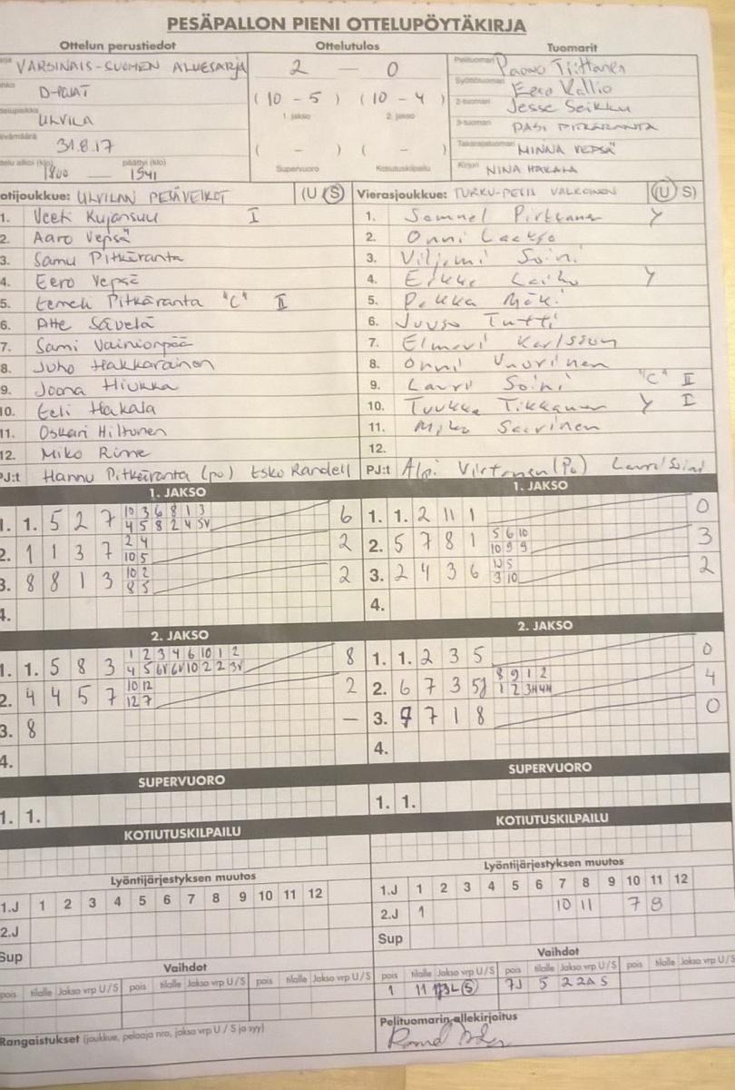 | 25.8.2017 | Ulvila | Pöytyä | 2-0 (11-0, 12-6) | näytä | |