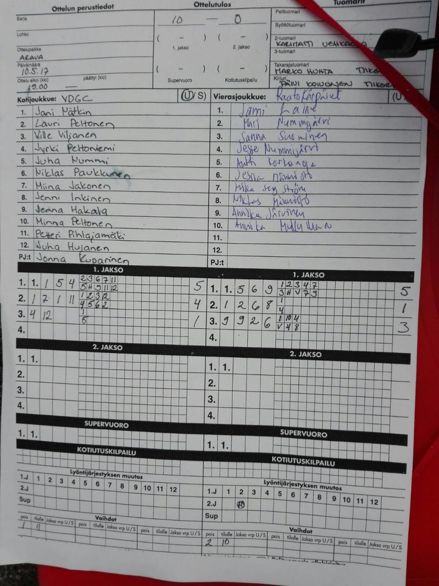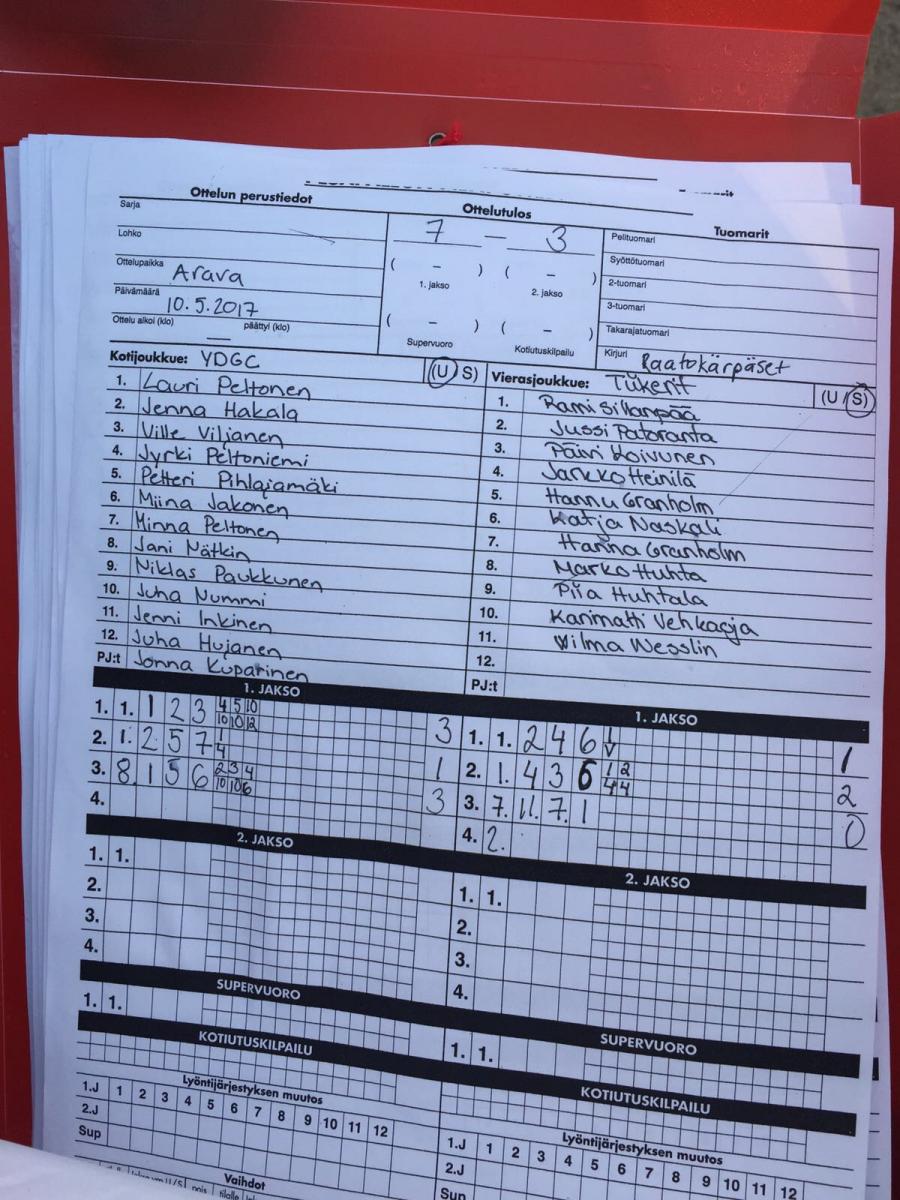 | Kuntopesissarja - Alkusarja | 6.5.2017 12:00 | Koulukeskus, Ulvila | Raatokärpäset | Ahmat | YDGC |