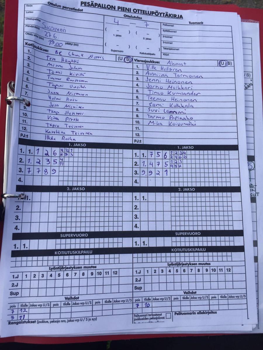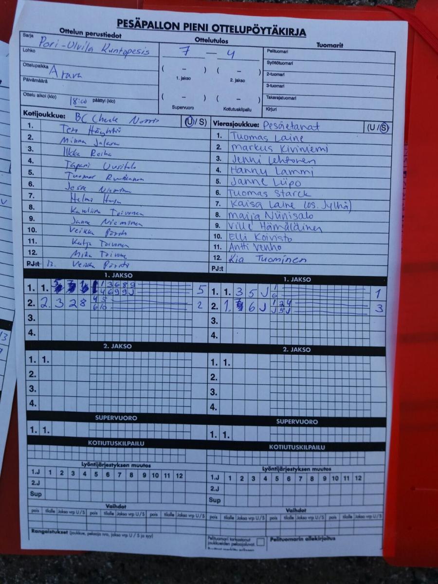 | Kuntopesissarja - Alkusarja | 14.6.2017 18:00 | Suosmeren kenttä, Ulvila | Rähmät | Raatokärpäset | BC Chuck Norris |