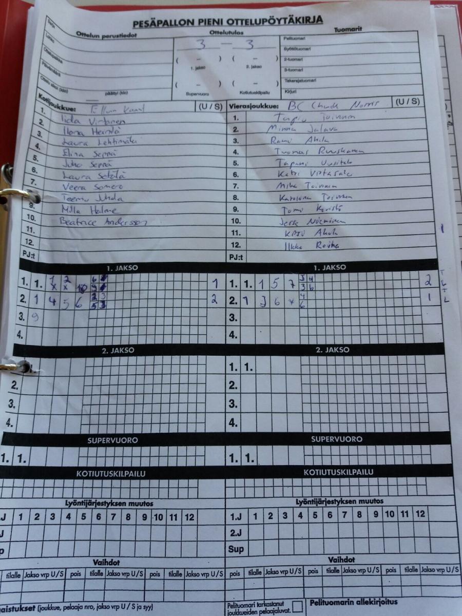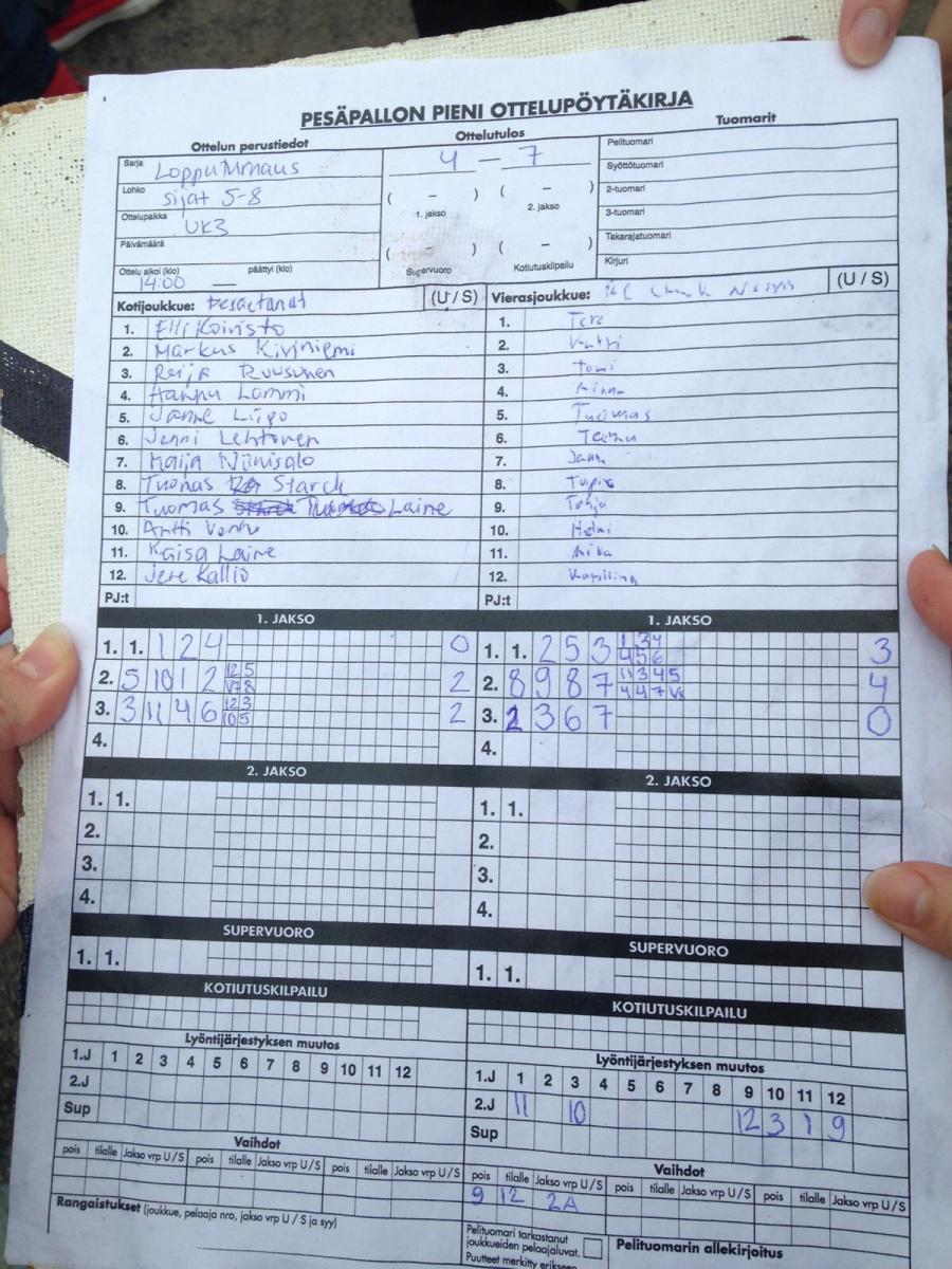 | Kuntopesissarja - Alkusarja | 7.6.2017 20:00 | Aravan kenttä, Pori | Team Kimble | Raatokärpäset | BC Chuck Norris |