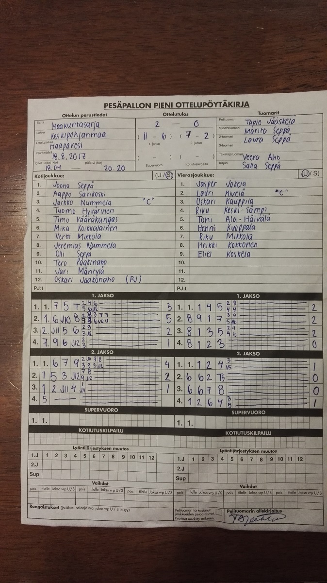 | 8.7.2017 | Kannus 4 | Toholampi | 2-1 (8-5, 4-9, 1-0) | näytä | |