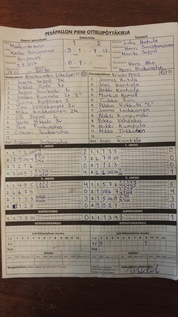 | 1.8.2017 | Haapavesi | Nivala | 1-2 (9-1, 7-12, 0-1) | näytä | |