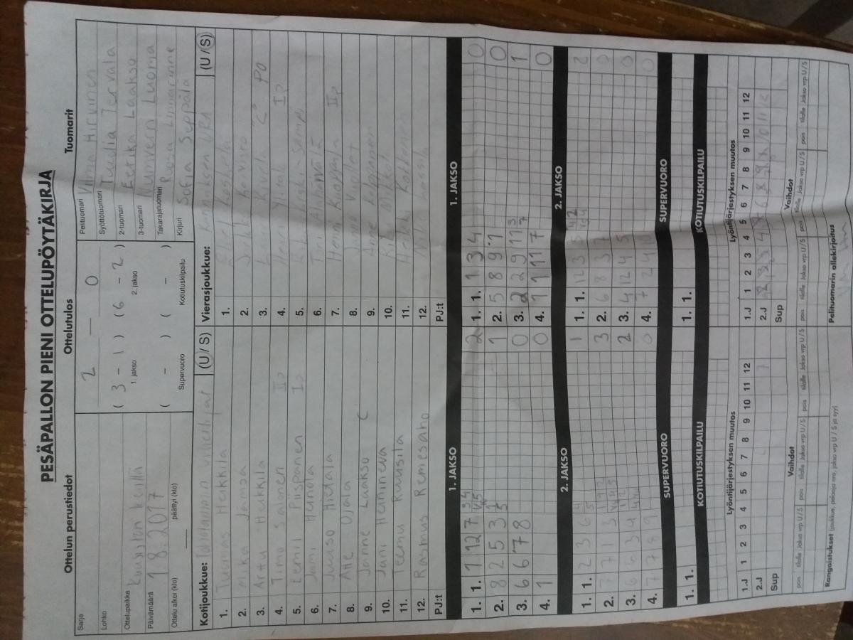 | 16.6.2017 | Toholampi | Kinnula | 0-2 (1-10, 2-17) | näytä | |