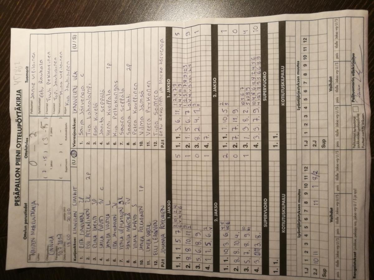 | 5.6.2017 | Toholampi | Kinnula | 1-2 (11-6, 5-7, 0-0, 1-2) | näytä | |