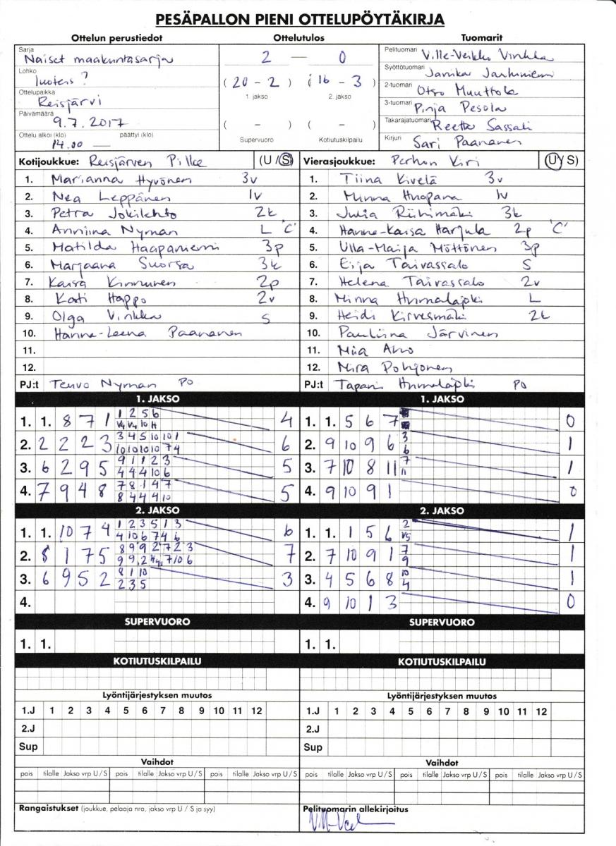 | 9.7.2017 | Reisjärvi | Perho | 2-0 (20-2, 16-3) | näytä | |