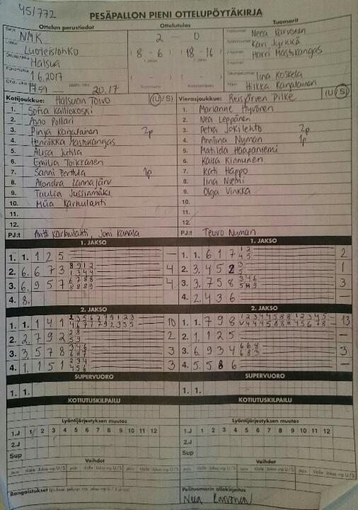 | 19.8.2017 | Halsua | Reisjärvi | 2-1 (12-7, 4-5, 2-1) | näytä |