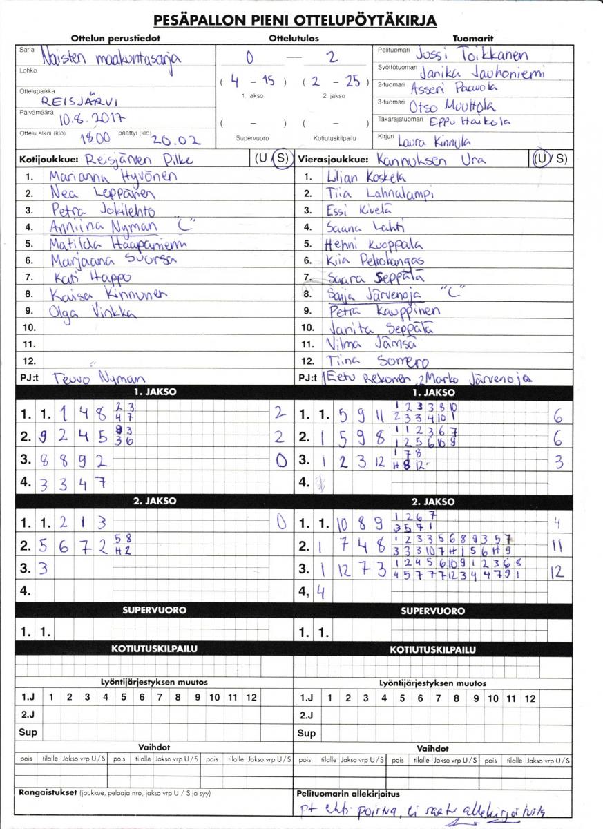 | 10.8.2017 | Reisjärvi | Kannus | 0-2 (4-15, 2-25) | näytä | |