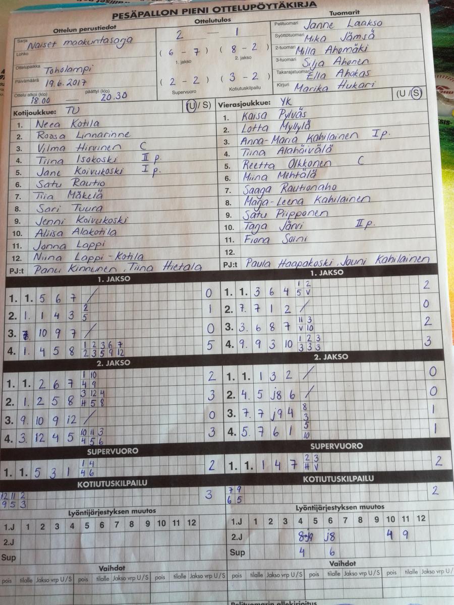 | 10.6.2017 | Haapajärvi | Toholampi | 2-0 (14-6, 11-10) | näytä | |