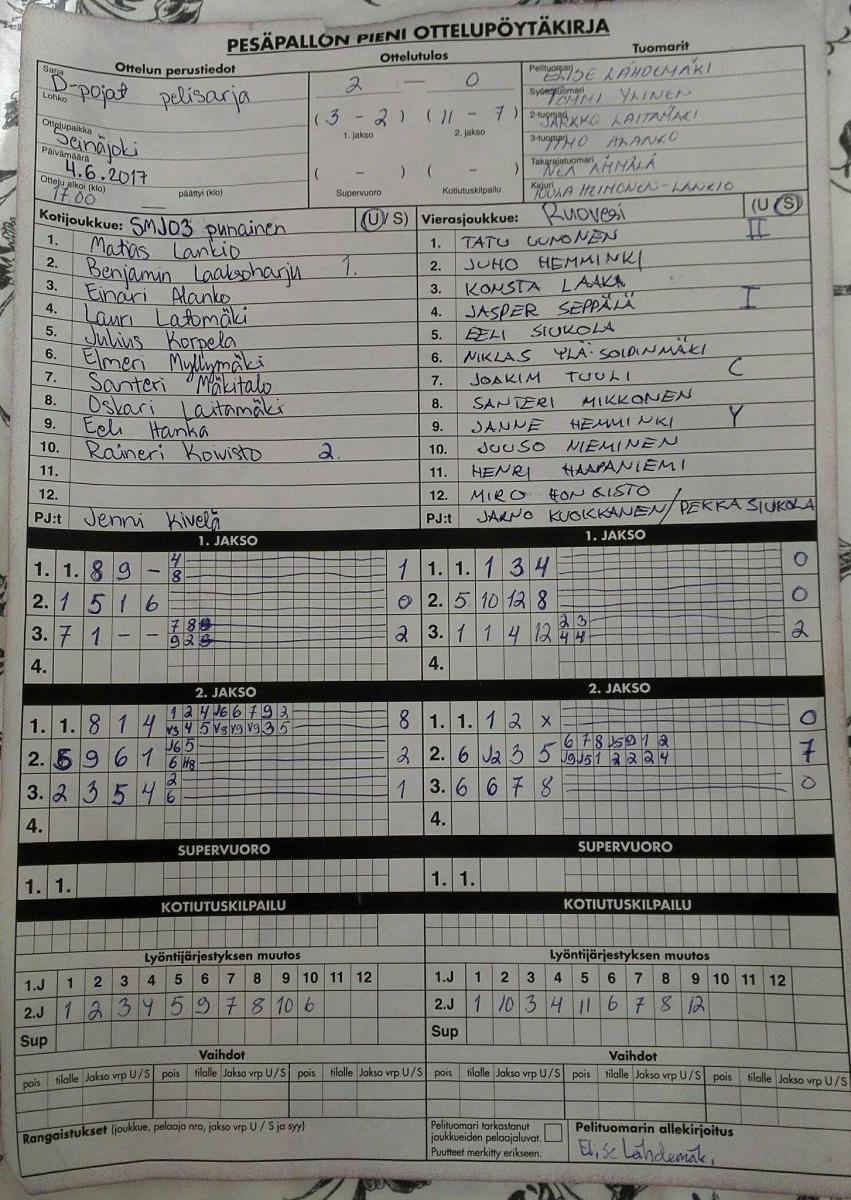 | 1.8.2017 18:00 | SMJ03 punainen | Virkiä | 2-1 (4-10, 11-7, 4-1) | ||