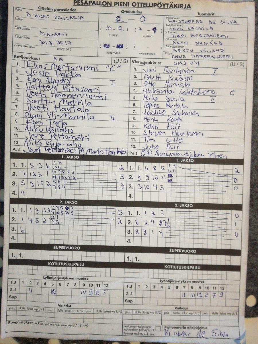 | 24.8.2017 18:00 | AA | SMJ04 | 2-0 (10-2, 7-1) | näytä |