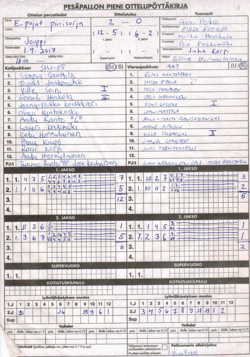 | 20.8.2017 18:00 | SMJ05 punainen | KoU | 2-0 (13-3, 10-4) | näytä |