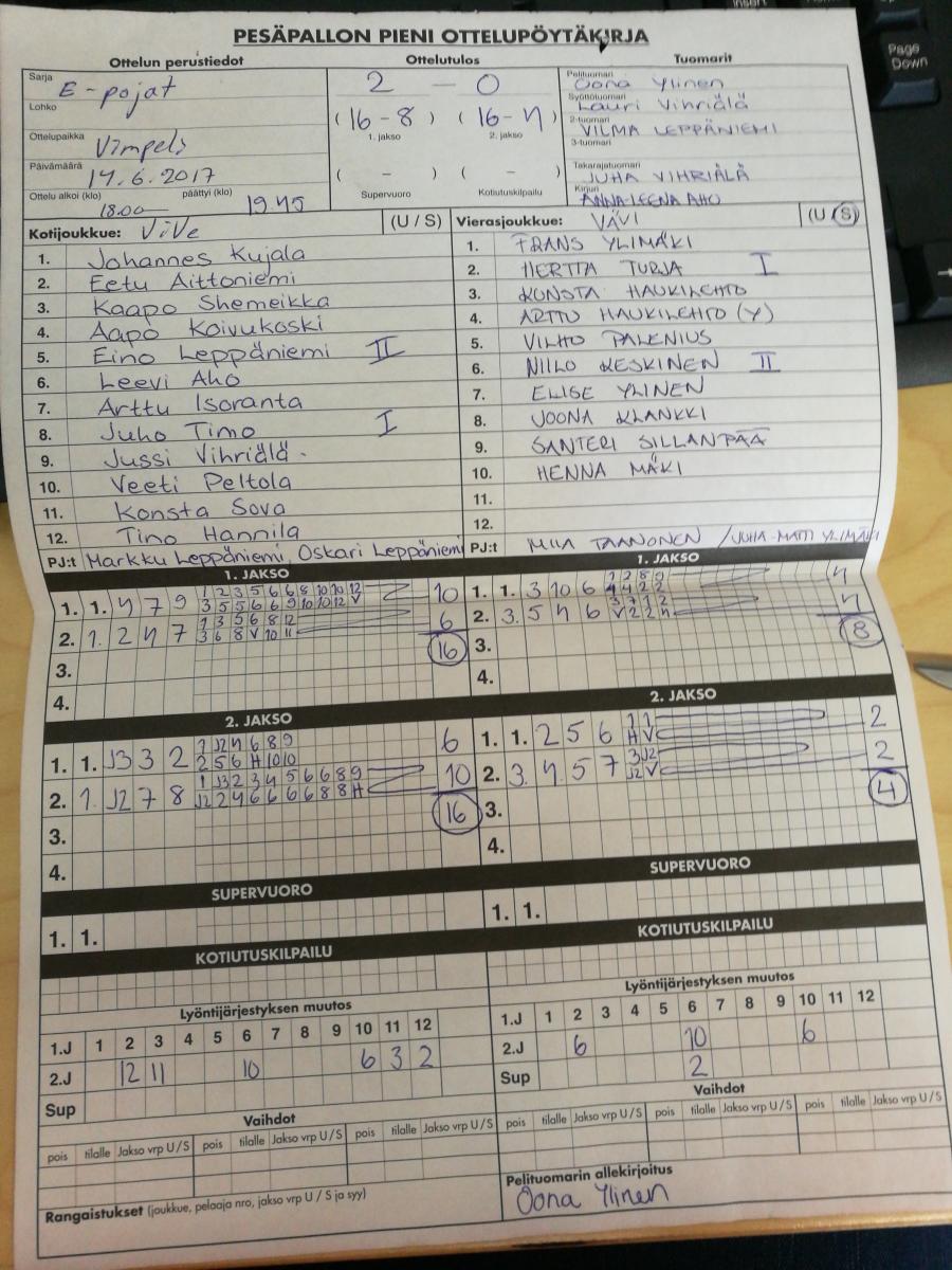| 20.5.2017 18:00 | ViVe | VäVi | 2-0 (16-8, 16-4) | näytä | |